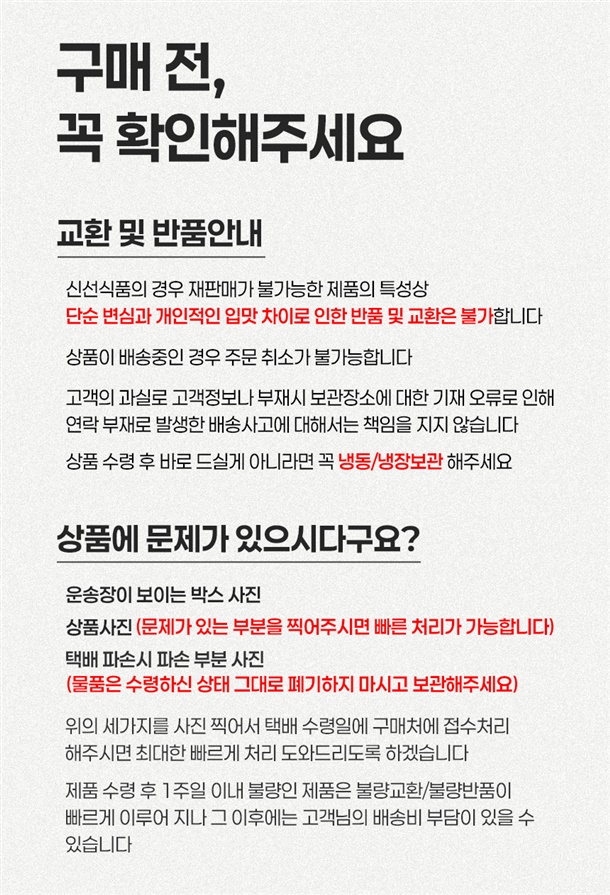 · 교환/반품 신청은 배송완료 후 7일 이내에 가능합니다.(극 신선품목의 경우 수령 후 24시간내 하자근거사진과 함께 접수해 주셔야합니다)