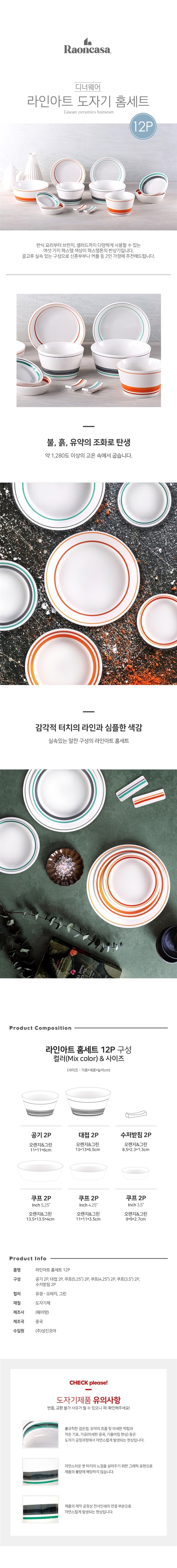 [라온까사] 라인아트 2인 도자기그릇 홈세트 12P