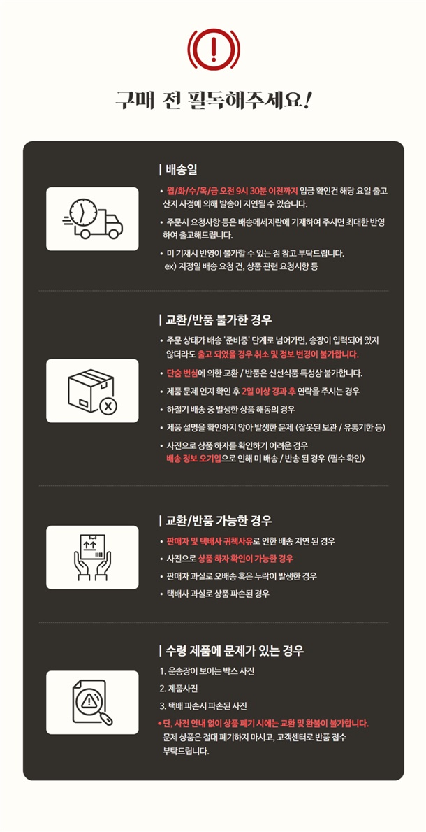 · 상품은 조기 배송될 수 있으며 배송일 지정은 불가합니다. 필요하신 경우 배송메세지 꼭 남겨주셔야 합니다 ( 배송메시지에 요청사항 기재없이 문의게시판 카톡채널등으로 문의 주시는경우, 순차답변으로 이미출고가 진행된경우에는 요청사항 처리가 어려울 수 있습니다 )